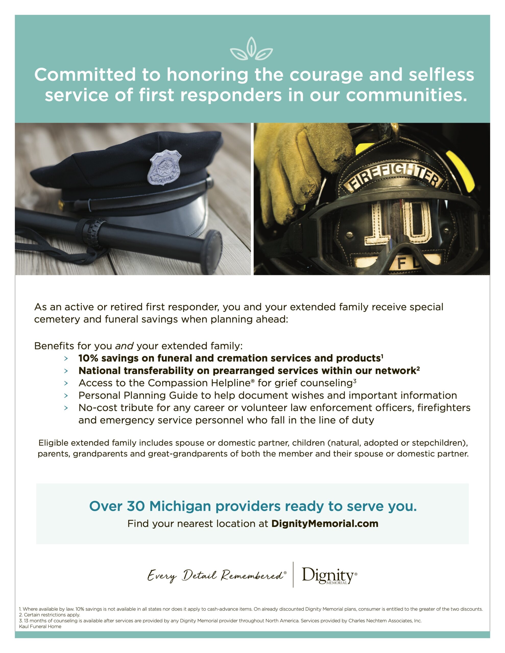 As an active or retired first responder, you and your extended family receive special cemetery and funeral savings when planning ahead: